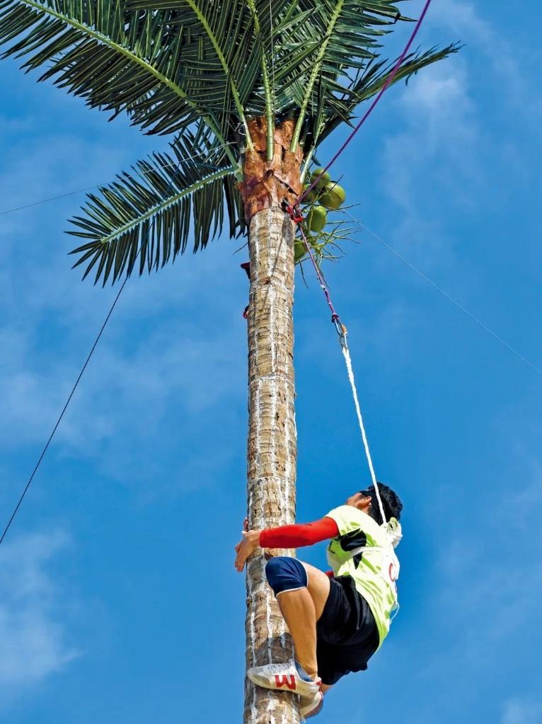 攀椰競(jìng)速是本屆運(yùn)動(dòng)會(huì)新增競(jìng)賽項(xiàng)目。比賽中,運(yùn)動(dòng)員要在9米(女子為7米)高的仿真椰子樹(shù)上攀爬,用時(shí)最短者獲勝。