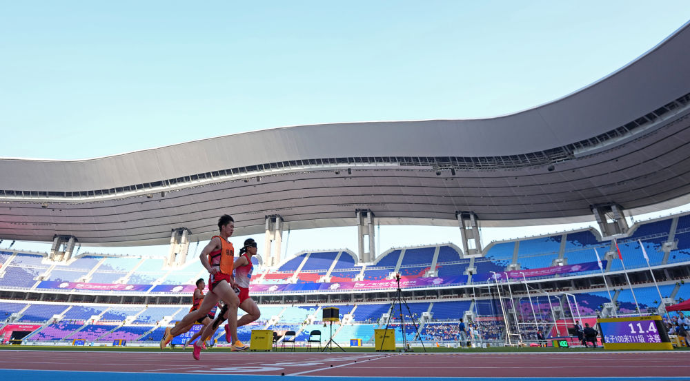 當日,伴隨著提振人心的醒獅表演,田徑、聾人籃球等項目都在簡短的開賽儀式后進入競賽環(huán)節(jié)。在廣東省奧體中心體育場舉行的田徑比賽傳來捷報,巴黎殘奧會兩銀得主、山東選手郭芊芊在女子400米T35級比賽中,以超世界紀錄、破全國紀錄的1分14秒65率先沖線。兩屆殘奧會冠軍、陜西隊的董飛霞在女子鉛球F55級比賽中摘下桂冠。在她的鼓勵下,陜西隊當天一共獲得6枚田徑金牌。