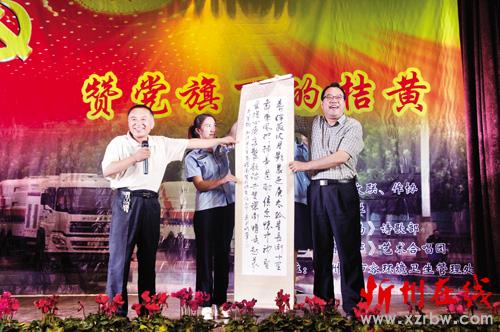 詩朗誦《我代表這個城市向你敬禮》 本報訊 7月3日晚8時,忻府區(qū)文聯、忻府區(qū)作家協會和遺山詩社在忻州市住建局禮堂共同舉辦了一場大型詩歌吟誦演唱會,用詩的語言、歌的韻律抒發(fā)了對黨的祝福和對環(huán)衛(wèi)工人的贊美。7月1日是黨的生日,在此之際,他們用詩歌表達對黨的熱愛,也表達對在黨旗下默默付出的勞動者們的敬意。 走進活動禮堂,一抹抹亮眼的桔黃映入眼簾,身著工服的環(huán)衛(wèi)工人們整齊地坐在座位上,三三兩兩小聲交談著,言語中透露著對詩歌吟誦演唱會的期待。此次“贊黨旗下的桔黃”詩歌吟誦演唱會,通過詩朗誦、唱紅歌等多種形式呈現,獨唱《東方紅》、合誦《中國夢》展現了對黨和祖國深情,《我代表這個城市向你敬禮》、《致清潔工》等詩朗誦用樸實的語言還原了環(huán)衛(wèi)工人真實的工作場景,用一件件小事彰顯他們的偉大。遺山詩社社長楊峻峰還將所作的關于環(huán)衛(wèi)工人的詩歌寫成書法作品,現場送給環(huán)衛(wèi)工人代表,用文字、用書法傳情。現場的一位觀眾、環(huán)衛(wèi)三所的趙艷平師傅告訴記者,“我是第一次參加這樣的詩歌聯誼會,不僅感受到社會對環(huán)衛(wèi)工人的理解和尊重,對我來說也是一次藝術方面的熏陶,挺有觸動的。” 我市市容環(huán)境衛(wèi)生管理處,是擔負城區(qū)環(huán)境衛(wèi)生管理和清潔的主要單位,幾十年來幾代環(huán)衛(wèi)工人為維護優(yōu)美潔凈的生活環(huán)境奉獻著自己的青春。在環(huán)衛(wèi)隊伍里,夫妻環(huán)衛(wèi)工、父子環(huán)衛(wèi)工、環(huán)衛(wèi)世家比比皆是,他們真正做到了寧臟我一個、潔凈千萬家。隨著一大批有知識、有文化的年輕人加入環(huán)衛(wèi)隊伍,在他們的共同努力下,相信我們的城市會更整潔舒適。(許凈 魯明強 韓麗萍 攝影報道)
