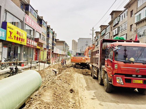 因?yàn)闅庀锬舷锫访孑^窄,地下雨水和污水管線的施工采用的是同槽開挖下埋。溝槽深度4米、寬度3.5米,雨水管線采用直徑分別為0.8米和1.2米的玻璃夾砂鋼管,污水管線采用直徑為50厘米的玻璃夾砂鋼管。為了安全,施工隊(duì)將開槽、下管和回填同步進(jìn)行。