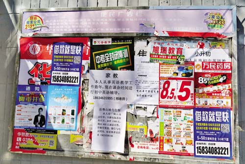 情況一:記者近日在忻州城區(qū)和平街一路口看到,一塊為市民提供告知服務(wù)的“便民公告欄”明確提示不允許張貼任何商業(yè)廣告,可是如今上面卻貼滿了商業(yè)廣告,而且張貼得極不整齊,這成為影響市容環(huán)境的一處死角,希望相關(guān)部門及時(shí)清理,也希望廣大市民按要求發(fā)布便民信息。