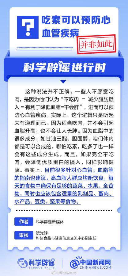 一些人不愿意吃肉,是因?yàn)樗麄冋J(rèn)為“不吃肉=減少脂肪攝入=有利于降低血脂=不會(huì)胖”,進(jìn)而可以預(yù)防心血管疾病。實(shí)際上,這個(gè)邏輯只是聽(tīng)起來(lái)有道理而已。因?yàn)檫m當(dāng)吃肉,并不會(huì)引起血脂升高,也不會(huì)讓人長(zhǎng)胖。如果完全不吃肉,會(huì)降低優(yōu)質(zhì)蛋白的攝入,同樣影響健康。(來(lái)源:@科學(xué)辟謠 中國(guó)新聞網(wǎng)微博)