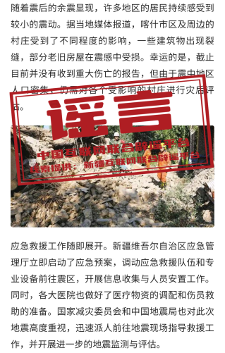 真相:近日,有網(wǎng)民發(fā)布帖文稱“新疆喀什市7月22日發(fā)生6.3級地震,周邊村莊建筑出現(xiàn)裂痕,部分老舊房屋在震感中受損……”。經(jīng)新疆喀什市應(yīng)急管理局證實,當(dāng)日喀什市域內(nèi)未發(fā)生地震,中國地震臺網(wǎng)也未發(fā)布喀什當(dāng)日發(fā)生地震的相關(guān)信息,此信息為虛假內(nèi)容。(來源:網(wǎng)信新疆、新疆喀什網(wǎng)絡(luò)舉報)
