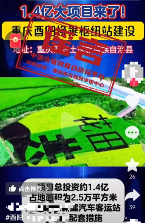 真相:近日,有網(wǎng)民發(fā)布信息稱“1.4億大項目來了,重慶酉陽換乘樞紐站建設,新建汽車客運站及相關配套”,引發(fā)關注。經(jīng)重慶市酉陽縣交通運輸委核實,酉陽縣正在推進桃花源景區(qū)游客集散中心提升項目,暫無“1.4億建設換乘樞紐站”項目,網(wǎng)傳信息系謠言。(來源:“重慶辟謠”微信公眾號)