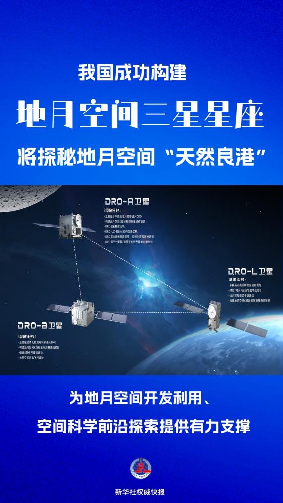 記者從中國科學(xué)院空間應(yīng)用工程與技術(shù)中心獲悉,我國已成功構(gòu)建由三顆衛(wèi)星組成的地月空間三星星座,將聚焦地月空間遠(yuǎn)距離逆行軌道(DRO)開展深入科學(xué)研究。