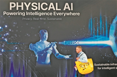 從制造業(yè)到醫(yī)療,從交通到家庭服務(wù),物理AI正以前所未有的深度融入并賦能各行各業(yè)。圖為一名男子在2026年美國拉斯維加斯消費電子展上走過印有物理AI字樣的展臺。新華社發(fā)(曾慧攝)