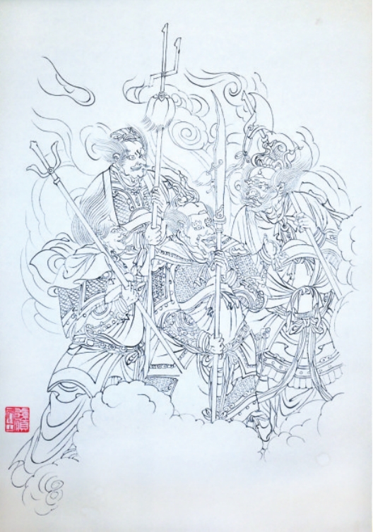更令李向東醉心不已的是,壁畫中人物衣袖明明是靜態(tài),卻似乎被微風(fēng)吹動(dòng)、卷起形成鼓動(dòng)之勢,仿佛下一秒就要隨風(fēng)起舞。在靜止的壁畫中,畫師勾勒出搖動(dòng)的扇面、飛舞的發(fā)絲,以及在眾仙家之間縹緲虛幻的云海,創(chuàng)造了靈動(dòng)出畫的動(dòng)態(tài)美。眾神佛道三五成群,看似錯(cuò)落隔離,卻又遙相呼應(yīng),彼此相望,顧盼生輝,呼之欲出。在人物群像中,李向東對(duì)金剛座神的畫法最為推崇——面目粗獷,體格魁偉,毛發(fā)濃密,一雙銅鈴般的眼睛微微斜視,須眉怒張,威風(fēng)凜凜。身體重心偏向一側(cè),一手持金剛杵于肩頭,一手探掌護(hù)于胸前,全身肌肉緊繃,顯示出畫師對(duì)線條的熟練運(yùn)用和高超的造型能力。