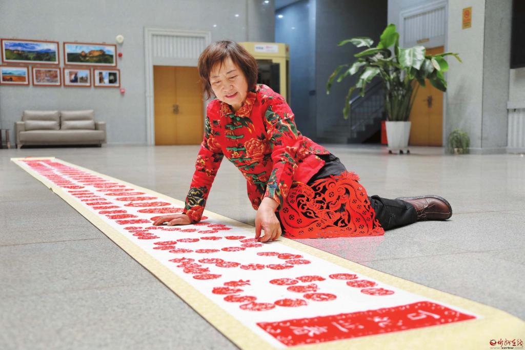 在位于岢嵐縣新時代文明實踐中心的非遺工作室內(nèi),柔和的燈光下,隨著紙屑紛紛落地,又一幅剪紙作品《金蛇賀歲》在非遺傳承人韋東梅的手中誕生了?!罢?00幅了!”摘掉老花鏡,韋東梅活動活動手指,雖然連續(xù)工作略顯疲憊,但從她的臉上看到更多的是作為創(chuàng)作者的滿足。 百蛇迎春 剪紙賀歲 工作室的地上,是一幅10米長卷,長卷上已經(jīng)被大小不同、神態(tài)各異的剪紙作品鋪滿。稍微活動一下筋骨,韋東梅把剛剛剪好的一幅作品用熨斗小心翼翼地熨平,然后像捧著嬰兒一樣輕輕把它放到長卷上去。100幅作品,充分運用了不同的剪紙語言形成豐富的構(gòu)圖。一一看過去,不管盤蛇還是卷蛇,個個造型夸張,神態(tài)鮮活,質(zhì)樸靈動,裝飾紋樣也是豐富多變,絕無雷同,撲面而來的是濃濃的年味兒和滿滿的祝福。難以想象這么多作品從設(shè)計到剪紙均出自一人之手。韋東梅介紹,這組作品中她運用了多種傳統(tǒng)吉祥元素:牡丹、如意、柿子、喜鵲、梅花、銅錢、蝙蝠、白菜、元寶、青蛙等,寄寓了蛇年吉祥、富貴平安、福壽三多、財源滾滾、事事如意等美好愿景。 “2025年是蛇年,蛇在傳統(tǒng)文化中寓意豐富,象征著吉祥、神圣、幸運、智慧、財富等等,蛇和龜也常常被視為長壽的象征。大家都希望過上幸福的生活,有夢想、有智慧,那日子還不是就像芝麻開花節(jié)節(jié)高?”韋東梅笑吟吟地說,她希望這些作品能夠為大家的美好生活錦上添花。