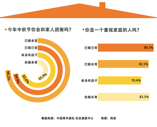 調(diào)查顯示,今年中秋節(jié),92.9%的受訪者會(huì)和家人團(tuán)聚。已婚未育的受訪者這一比例最高(98.2%),未婚未育受訪者這一比例最低(65.9%)。