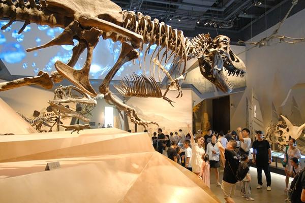 8月21日,浙江湖州,游客在恐龍館內(nèi)參觀。暑假進(jìn)入尾聲,位于湖州市安吉縣的浙江自然博物院熱度不減。視覺中國(guó)供圖
