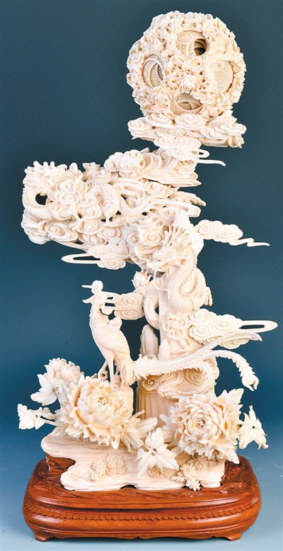 象牙球旁邊放著象牙微雕工藝創(chuàng)始人馮公俠雕刻的屈原《九歌》。拇指大的小座屏上刻有1700余字,肉眼看是密密麻麻的黑點(diǎn),置于放大鏡下,可以看見每個(gè)字筆畫清晰工整。