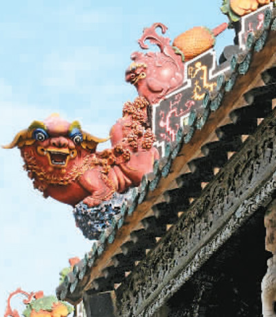 “三雕兩塑”(石雕、木雕、磚雕、陶塑、灰塑)是嶺南傳統(tǒng)建筑常用構(gòu)件。陳家祠建筑屋頂上裝飾著層疊錯(cuò)落、精致繁復(fù)的陶塑和灰塑,堪稱一大亮點(diǎn)。曾翔介紹,最頂層的陶塑瓦脊就是著名的“石灣陶”,在廣東佛山石灣鎮(zhèn)燒制而成,內(nèi)容一般以粵劇故事、花卉和吉祥圖案為主。瓦脊下方的基座是灰塑。灰塑的制作工藝比較特別,用石灰摻入糖膠、稻草、糯米等混合發(fā)酵后,往房頂?shù)你~鐵骨架上填抹塑形,再涂上顏色?;宜軟]有經(jīng)過高溫?zé)疲菀资茱L(fēng)雨侵蝕而剝落掉色,每隔五六年就要進(jìn)行保養(yǎng)修復(fù)。