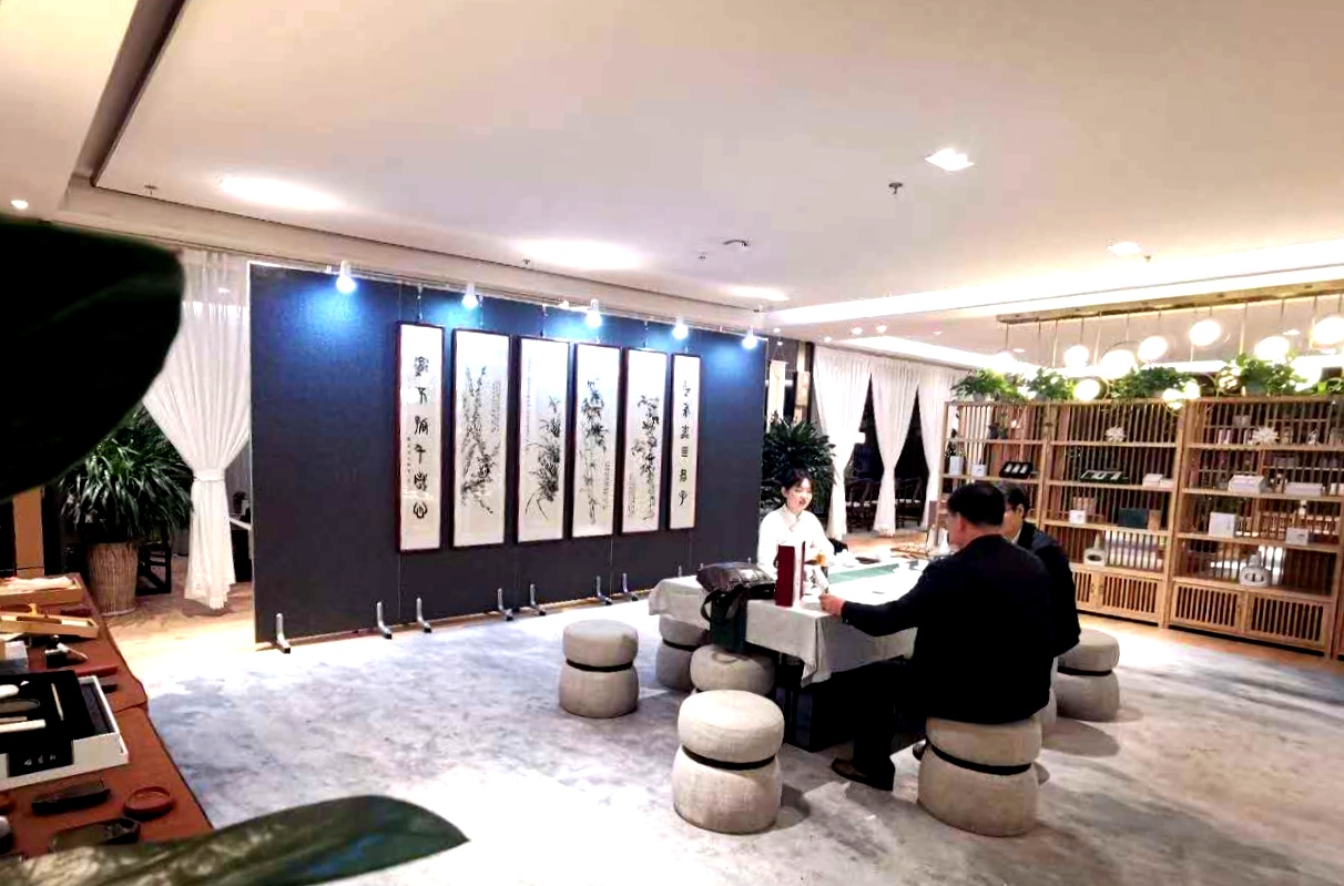繞過木架綠植,穿行于鋪陳有字貼宣紙的書案,現(xiàn)場彈奏的琵琶古韻從耳畔飄過,茶香伴著墨香沁人心脾。你可以駐足細(xì)品這些書畫的精微高超之處,你可以圍桌而坐品茗閑談,興起時你還可以搖管潑墨揮灑一番……