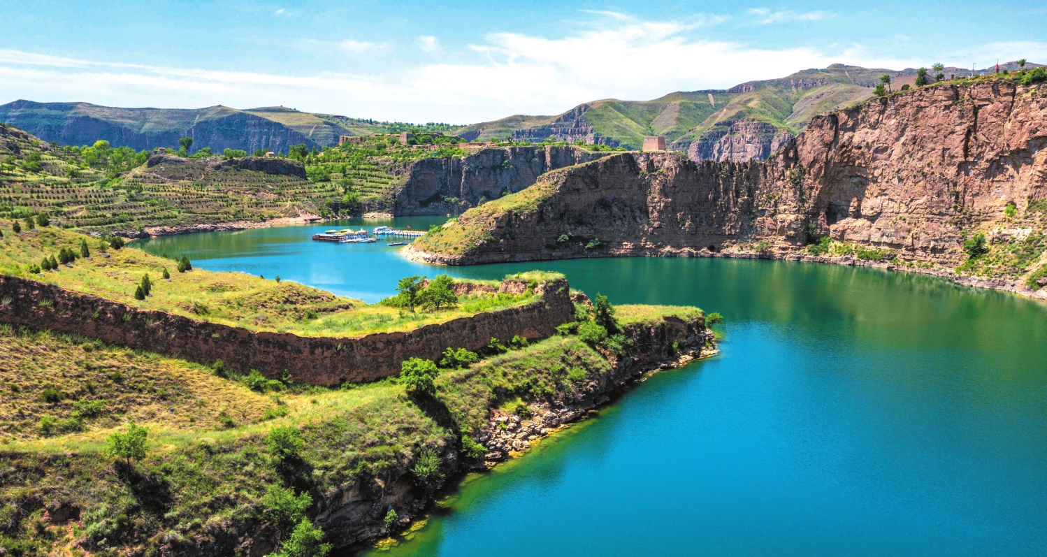 從壺口到禹門口,沿途有不少觀景臺,下臨深谷,白浪翻卷,水聲響亮。黃河泛黃時候,觀景臺上只聞水聲轟鳴,看不出浪花。此時黃河清,白浪顯,成了新景。抵達(dá)禹門口,黃河也是綠的,游艇在河里開過,水面上劃出道道波紋,宛如鋪展著的巨幅油畫。