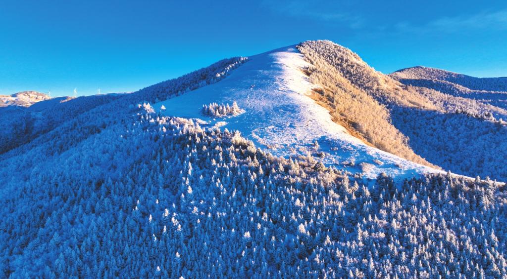 冬之凈,返璞歸真的意蘊(yùn)。當(dāng)一場大雪如期而至,金山梁便徹底沉靜下來,進(jìn)入一個冰雕玉砌的童話世界。梁頂之上,積雪平整如鏡,宛如瓊瑤鋪地,反射著清冷而純粹的日光。而當(dāng)陽光突破云層,照射在冰面上,則光芒閃耀,令人不敢直視。松枝上堆滿了蓬松的積雪,傲立于山崖,盡顯在嚴(yán)酷中堅守的堅韌品格;山間那些奇形怪狀的巖石,覆上白霜后,更是空蒙清靈,意韻悠長。生命的痕跡并未完全消失,偶有野兔為了覓食奔躍而過,在雪地上留下一串輕盈的足跡,但轉(zhuǎn)瞬便被新雪覆蓋,似乎了無痕跡;時有耐寒的鳥兒掠崖飛去,翅羽間振落的冰晶,在空中劃出一道優(yōu)美的弧線。