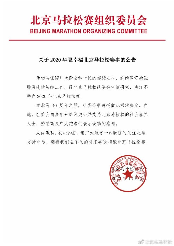 人民網(wǎng)北京12月3日電(楊磊) 12月3日,北京馬拉松組委會在官方微博上宣布,2020年北京馬拉松將不再舉辦。