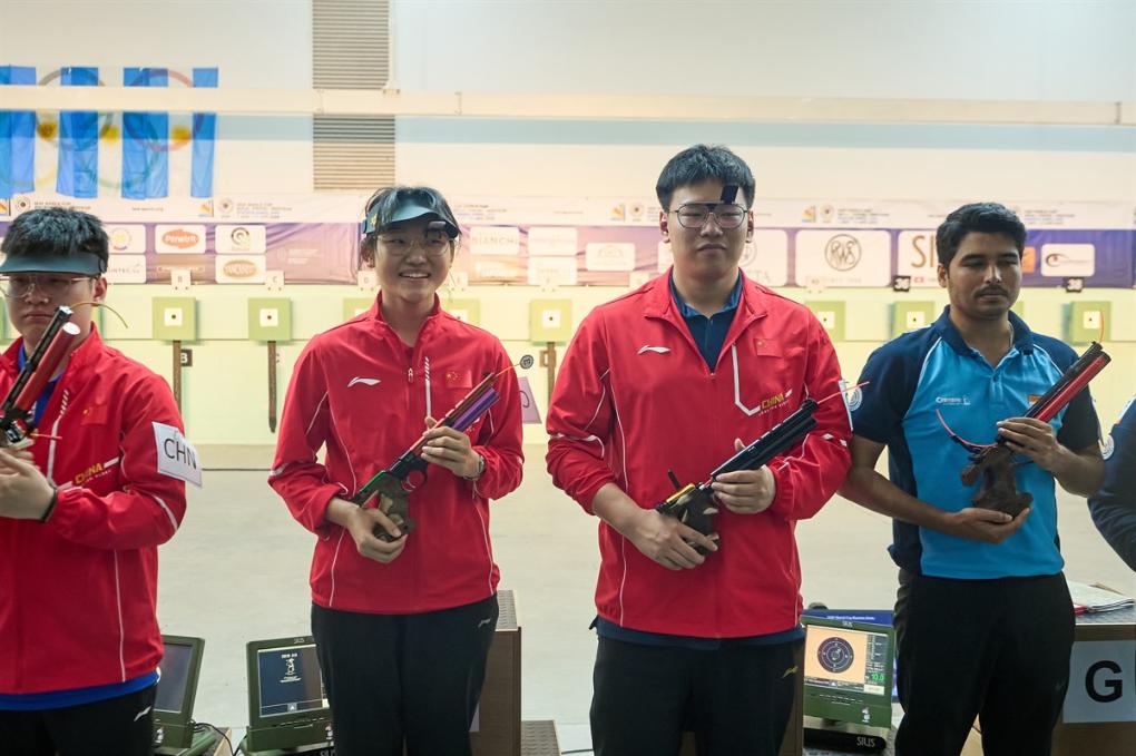 10米氣手槍混合團(tuán)體冠軍張益梵(右二)/馬千珂(右三)在比賽現(xiàn)場(chǎng)。圖片來自國(guó)際射聯(lián)官網(wǎng)