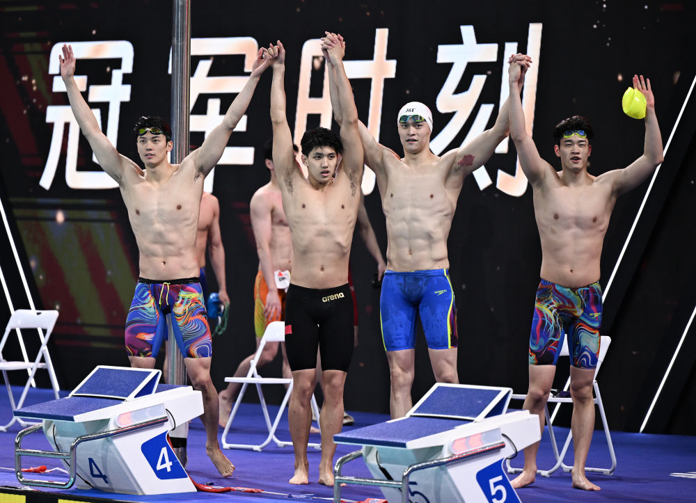 男子4X200米自由泳接力決賽,由汪順、費立緯、孫楊和潘展樂組成的浙江隊以7分12秒76的成績奪冠。第一棒汪順為浙江隊建立優(yōu)勢,交接時已超出第二名一個身位,此后費立緯繼續(xù)擴大領先,孫楊和潘展樂沒有給對手追趕的機會,浙江隊以領先第二名超過3秒的優(yōu)勢奪冠。山東隊和公安體育協(xié)會隊分列二、三位。