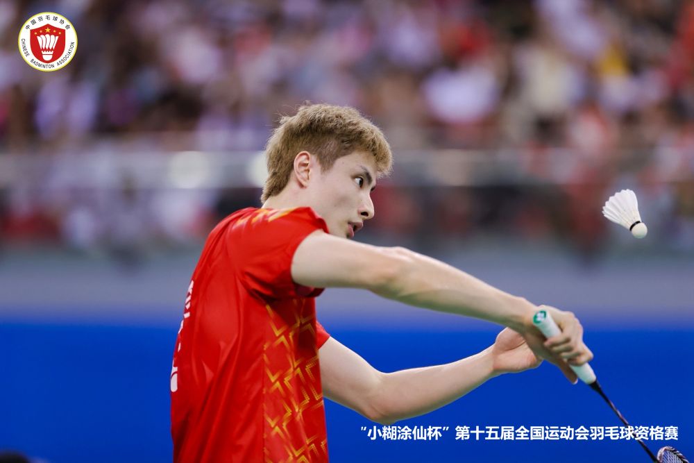 8月18日,江蘇隊(duì)石宇奇在第十五屆全國運(yùn)動會羽毛球資格賽中回球。(組委會供圖)