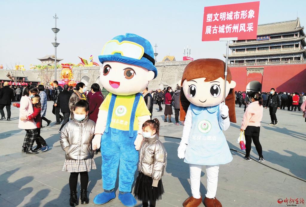 2月26日,農(nóng)歷辛丑年元宵節(jié),忻州古城北城門(mén)樓廣場(chǎng)上,兩名卡通形象裝扮的環(huán)保志愿者向群眾宣傳環(huán)保政策法規(guī),倡導(dǎo)環(huán)保過(guò)節(jié)、文明旅游。為豐富和活躍群眾文化生活,展現(xiàn)忻州古城保護(hù)活化新成就,元宵節(jié)期間,忻州古城舉行了社火游行,吸引了廣大市民。忻州市環(huán)保志愿者協(xié)會(huì)借機(jī)組織了環(huán)保宣傳活動(dòng)。 (張劍雄 攝)