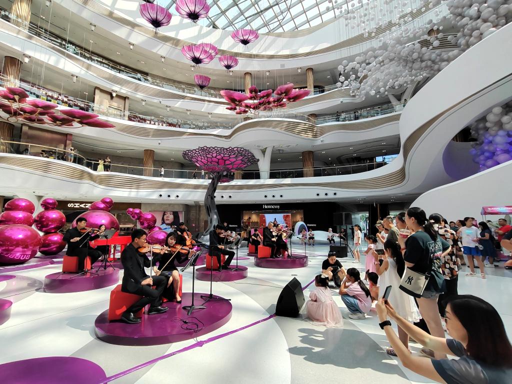 端午假期,海口國際免稅城內(nèi),伴隨著悠揚的音樂,陽光傾瀉“天際秘林”夢幻舞臺,正在購物的游客們紛紛駐足欣賞。“一場室內(nèi)音樂會,給購物消費增添了新意和氛圍感。”??谑忻耜惱俪两陉柟夂鸵魳分?。