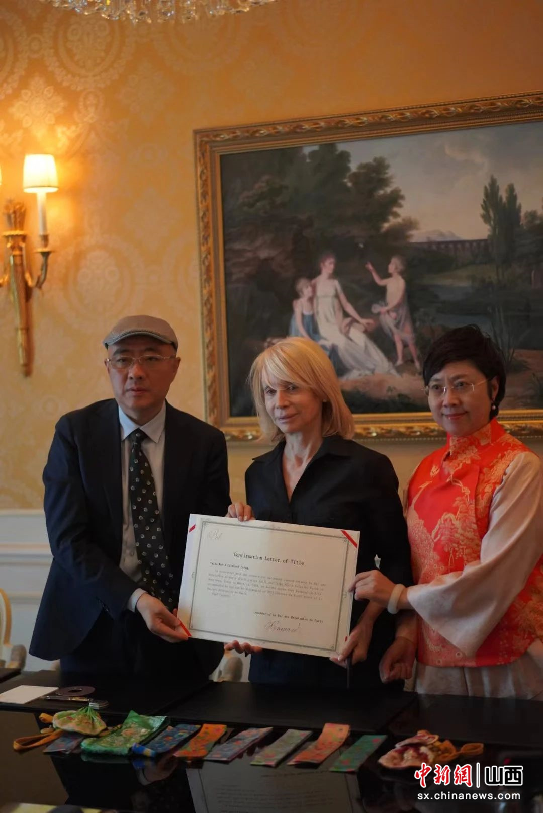 圖為:太湖世界文化論壇副主席兼秘書長鄭傳焮(左)、巴黎名媛舞會(huì)創(chuàng)始人奧菲莉·雷努阿(中)、中國國家級(jí)非物質(zhì)遺產(chǎn)保護(hù)織造技藝(潞綢)傳承人王淑琴在簽約儀式現(xiàn)場。