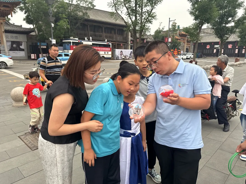活動現(xiàn)場,在一個特殊的攤位上,由近到遠分別擺放著“冰毒”“海洛因”“搖頭丸”等各種眼花繚亂的毒品仿真模型?!皝韥韥?,走過路過不要錯過!”“瞧一瞧,看一看!”禁毒社工在“攤位”前賣力吆喝著,一陣陣吆喝聲引來了眾多游客,游戲通過套圈的方式,組織游客套中現(xiàn)場的毒品模型并準確說出毒品名稱即可獲得扇子、手機支架、帆布包等獎勵。