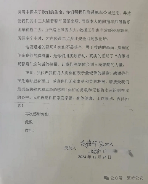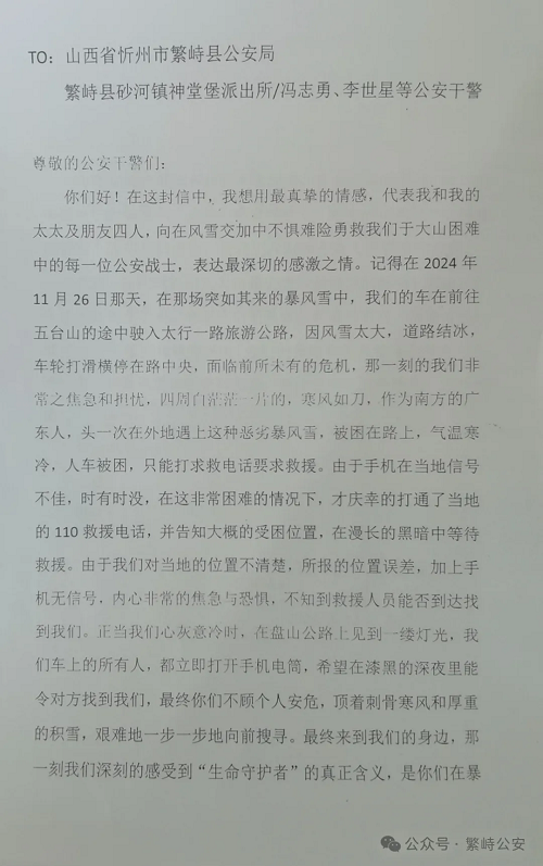| 繁峙公安民警雪夜救援,司機(jī)千里寄信以示感激 |